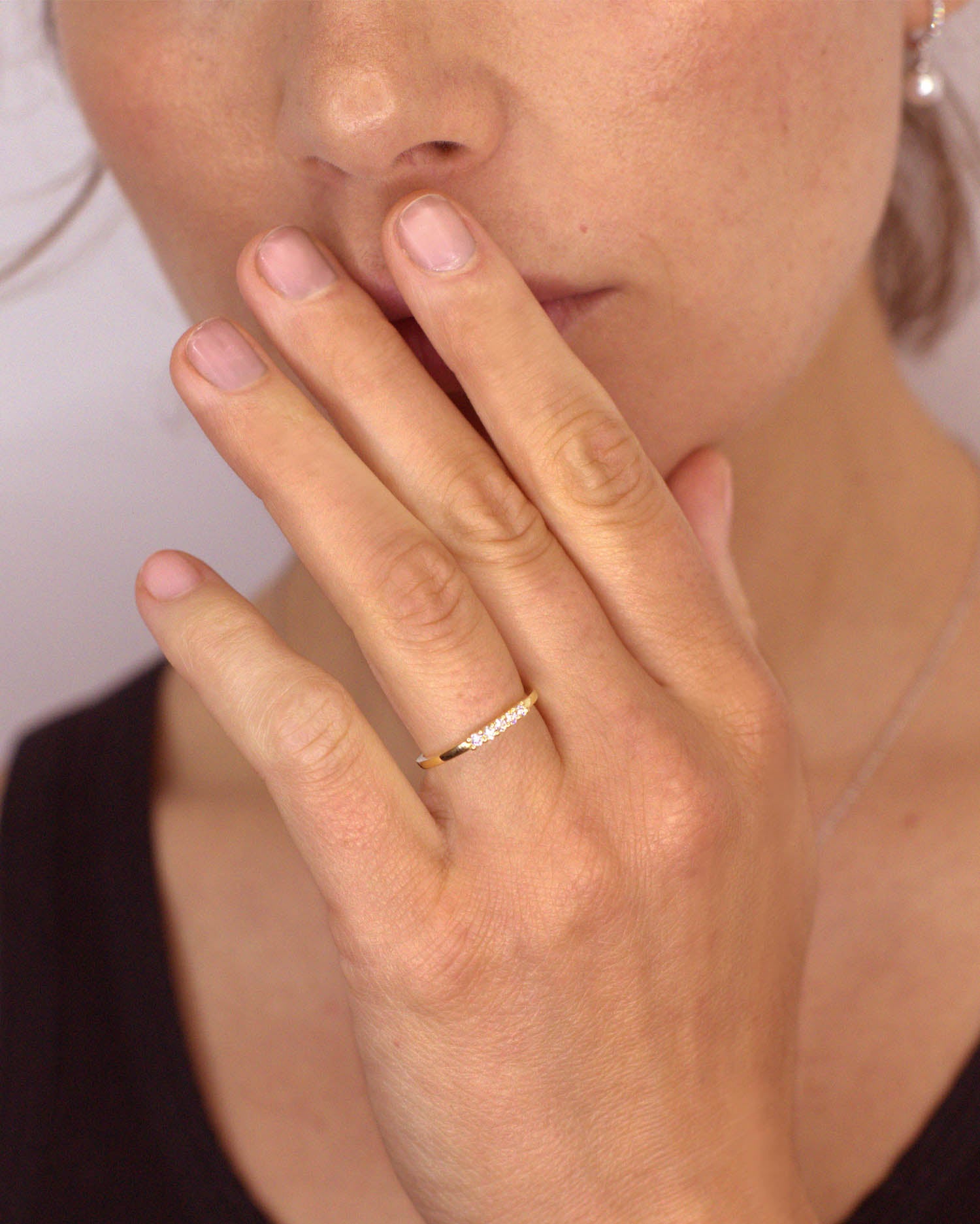 Simple i elegant, una línia de llum brillant envolta aquest clàssic reinventat eternament bell. Un complement ideal per combinar amb altres anells. Anell d'or blanc de 18kt amb diamants talla brillant. Pes total en quirats 0,18. Color Diamant: FG. Puresa VS