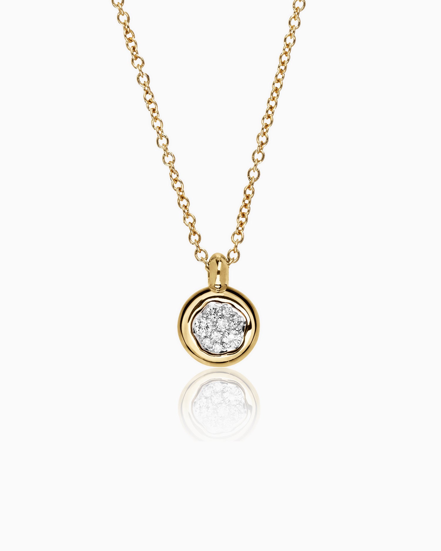Un petit pavé de diamants es dibuixa dins d'una forma irregular però precisa, on un encastat gairebé invisible permet a aquesta peça brillar de forma màgica. Penjoll d'or groc amb diamants talla brillant. Pes total a ct 0,15. (El preu del penjoll inclou la cadena en or de 18kt, de 45cm de llargada, amb una anella intercalada a 42cm.) Diamant: FG. Puresa VS