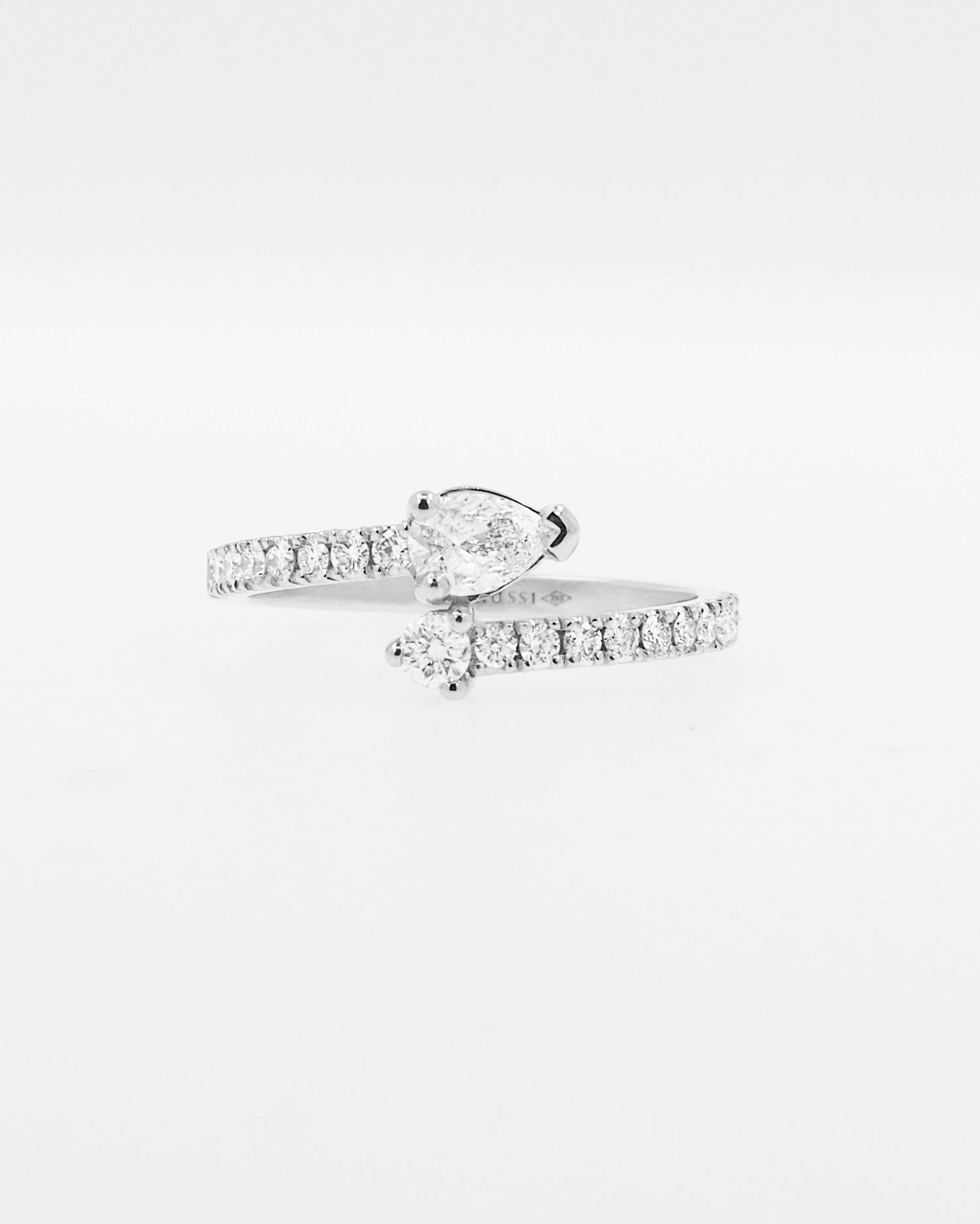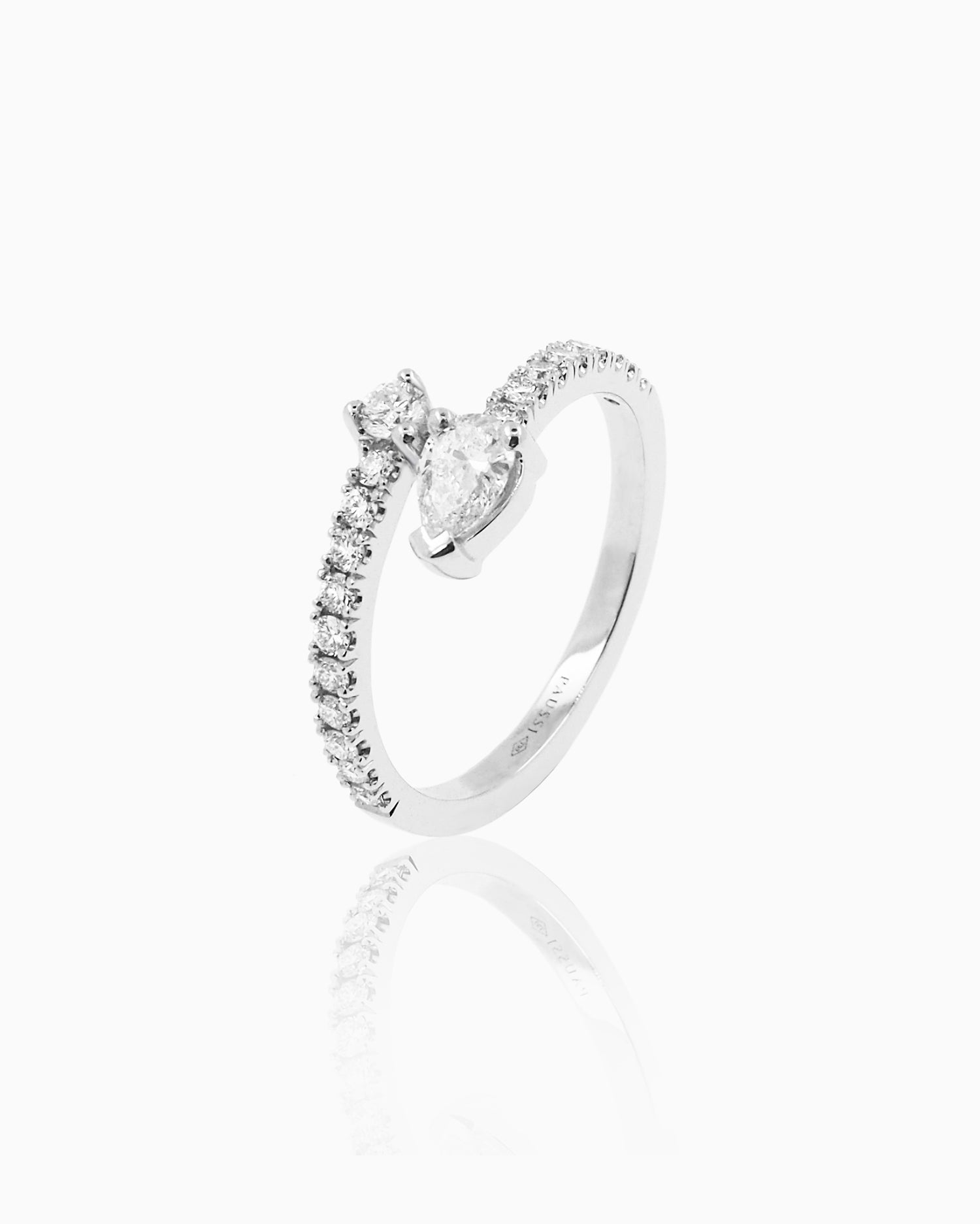 L'anell Stiletto Pavé és essencial i contemporani, amb una línia de pedres elegants que formen una mitja aliança. Fet d'or blanc de 18 Kt, compta amb un enlluernador diamant talla pera de 0,27 ct i un quilatatge total de 0,33 ct.