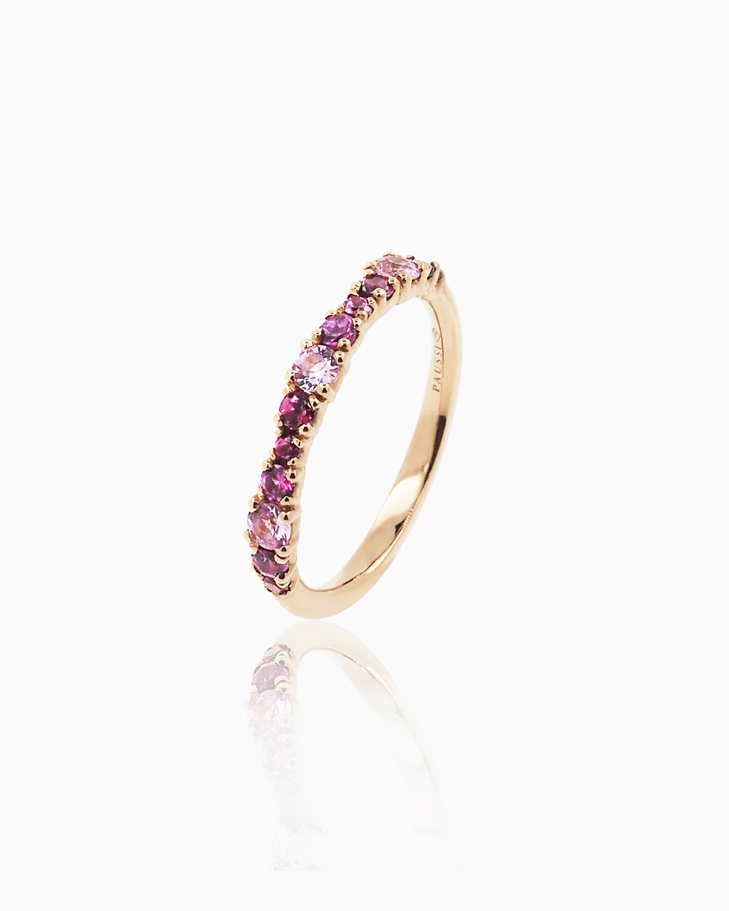 A line of soft and elegant stones forming an essential and contemporary half-weave ring. 18kt rose gold ring with sapphires, rhodolites and four diamonds with a total weight of 0.08 ct. Diamond Color: FG. Clarity: VS