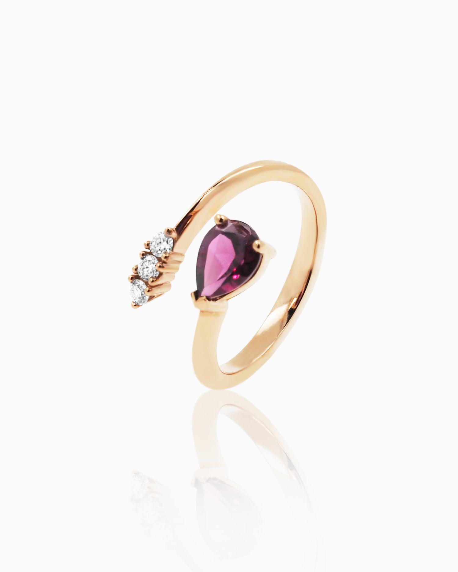 Vibrant, fun colours, essential pieces for women who don't want to go unnoticed. Create your own look by combining it with other rings. Discover them. 18kt rose gold ring with rhodolite and three diamonds. Total weight in ct 0.12. Diamond colour: FG. Clarity VS.