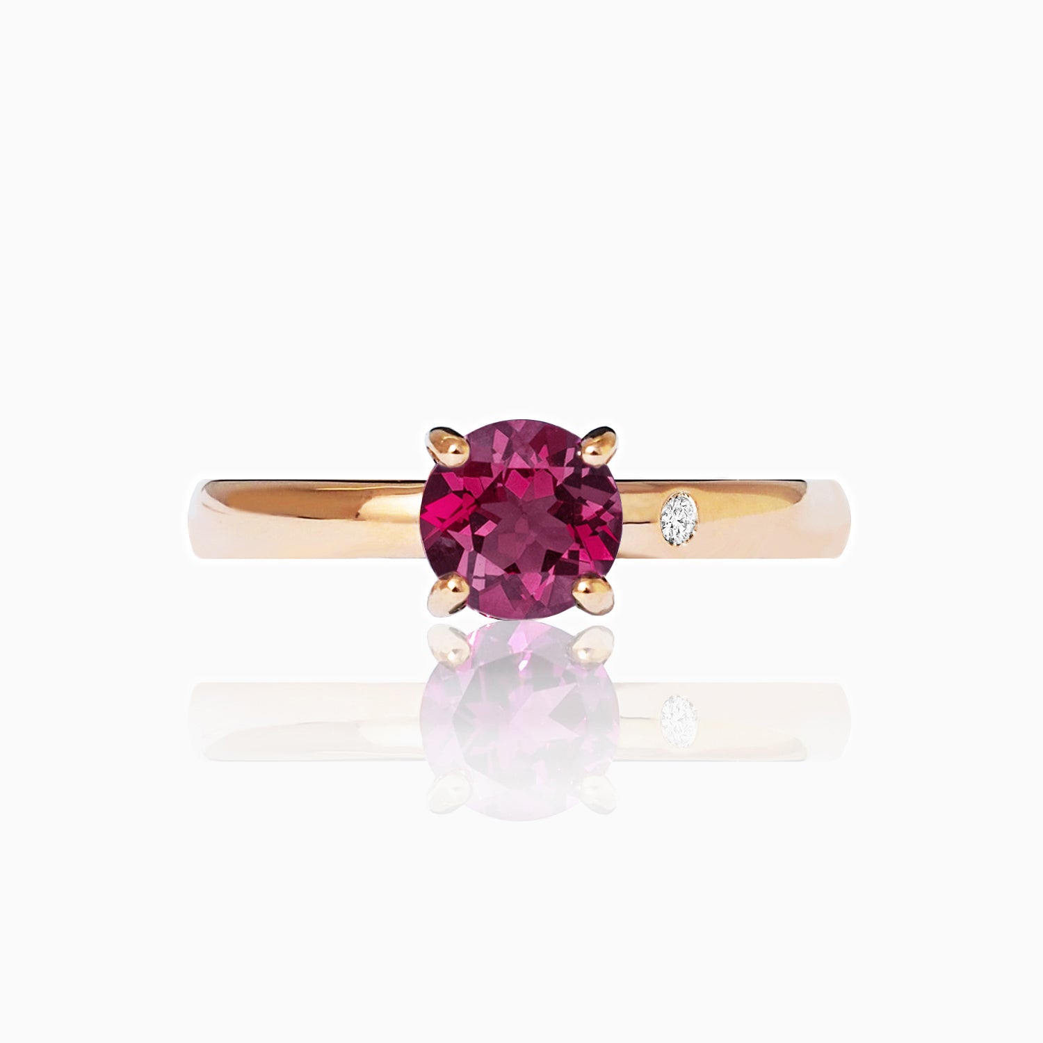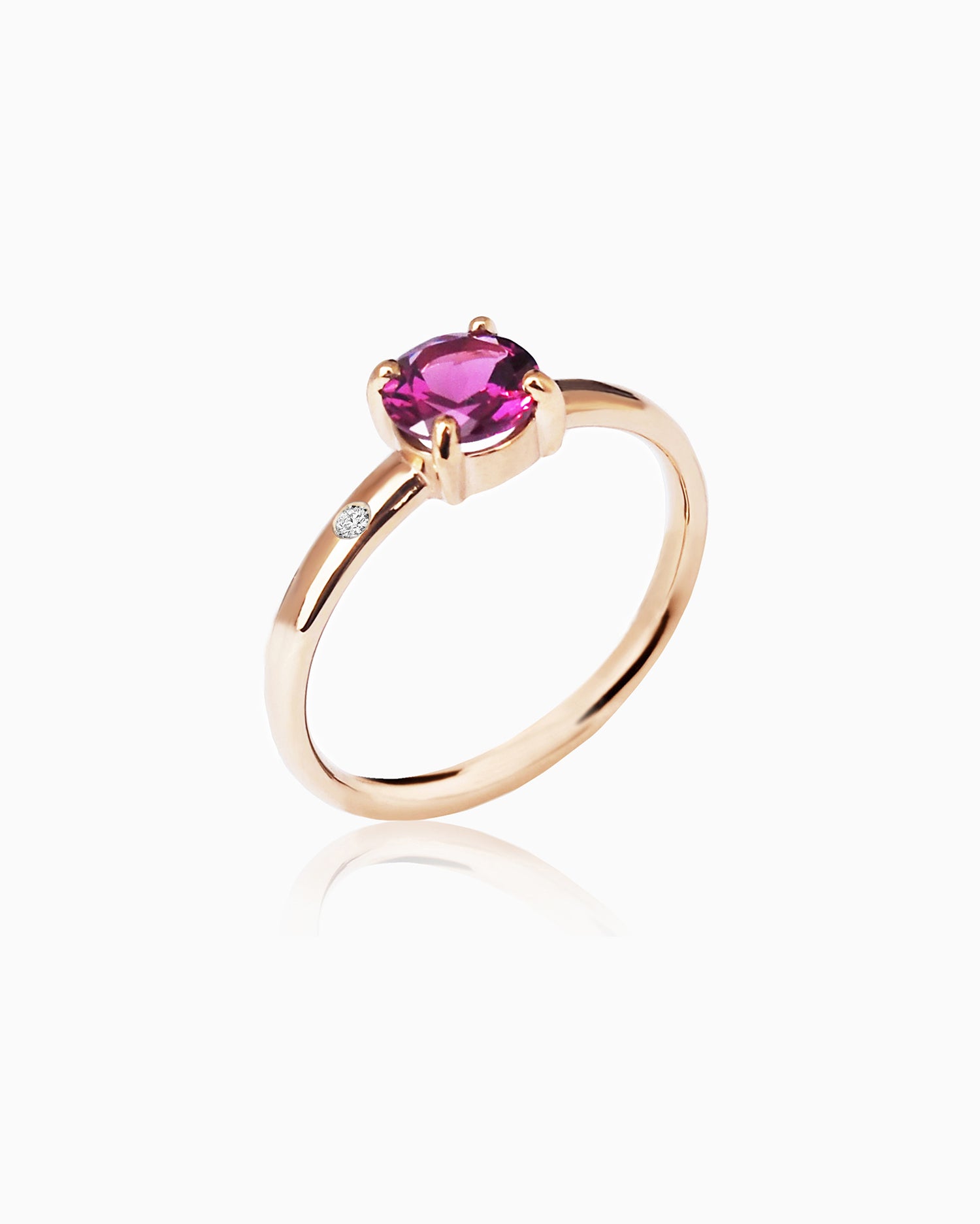 Vibrant, fun colours, essential pieces for women who don't want to go unnoticed. Create your own look by combining it with other rings. Discover them. 18kt rose gold ring with rhodolite and diamond. Diamond colour: FG. VSPurety VSpurity
