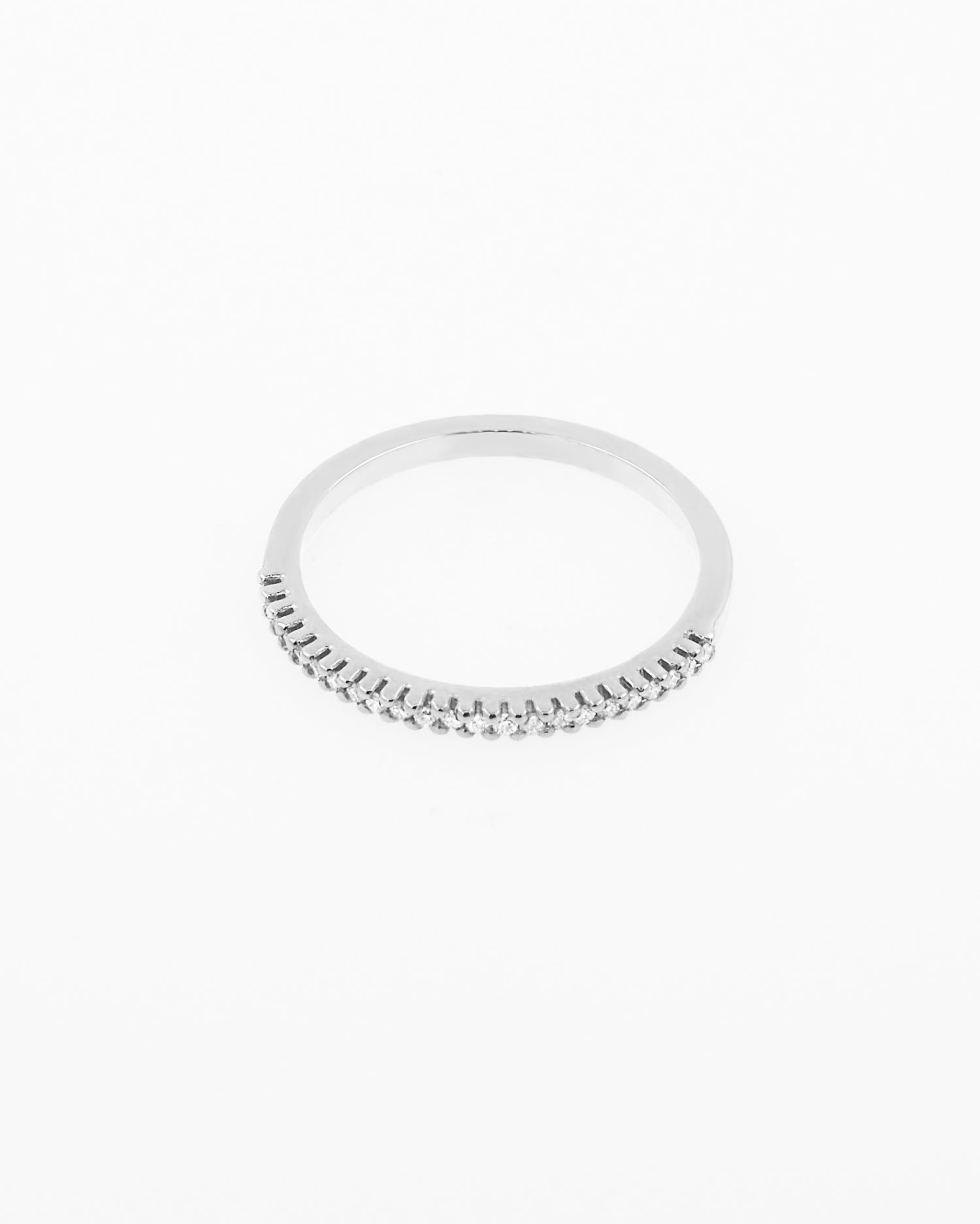 Our Essential ring is simple and elegant, reinventing a classic with a line of sparkling light. Made of 18kt white gold and brilliant-cut diamonds, it is the perfect complement to combine with other rings.
