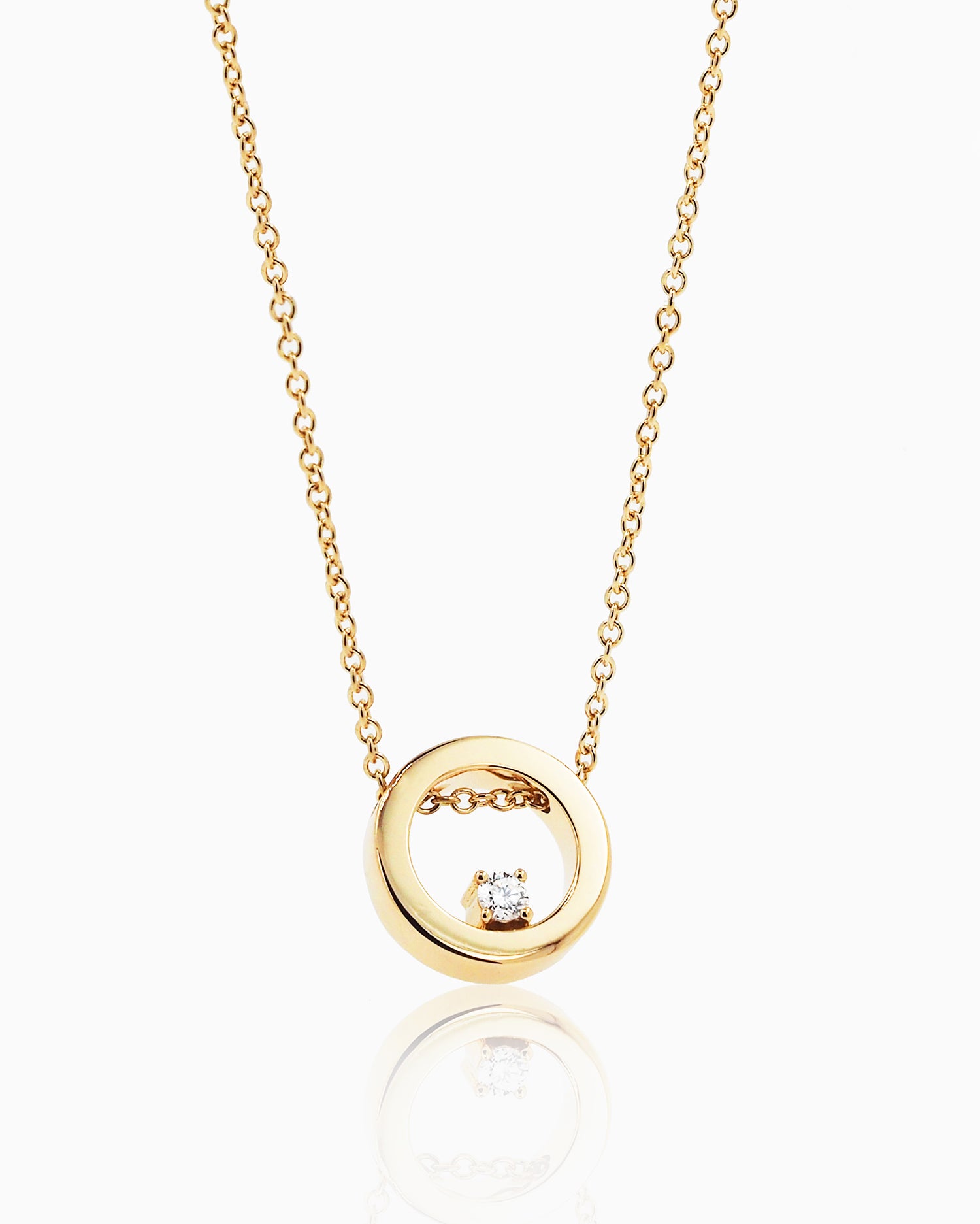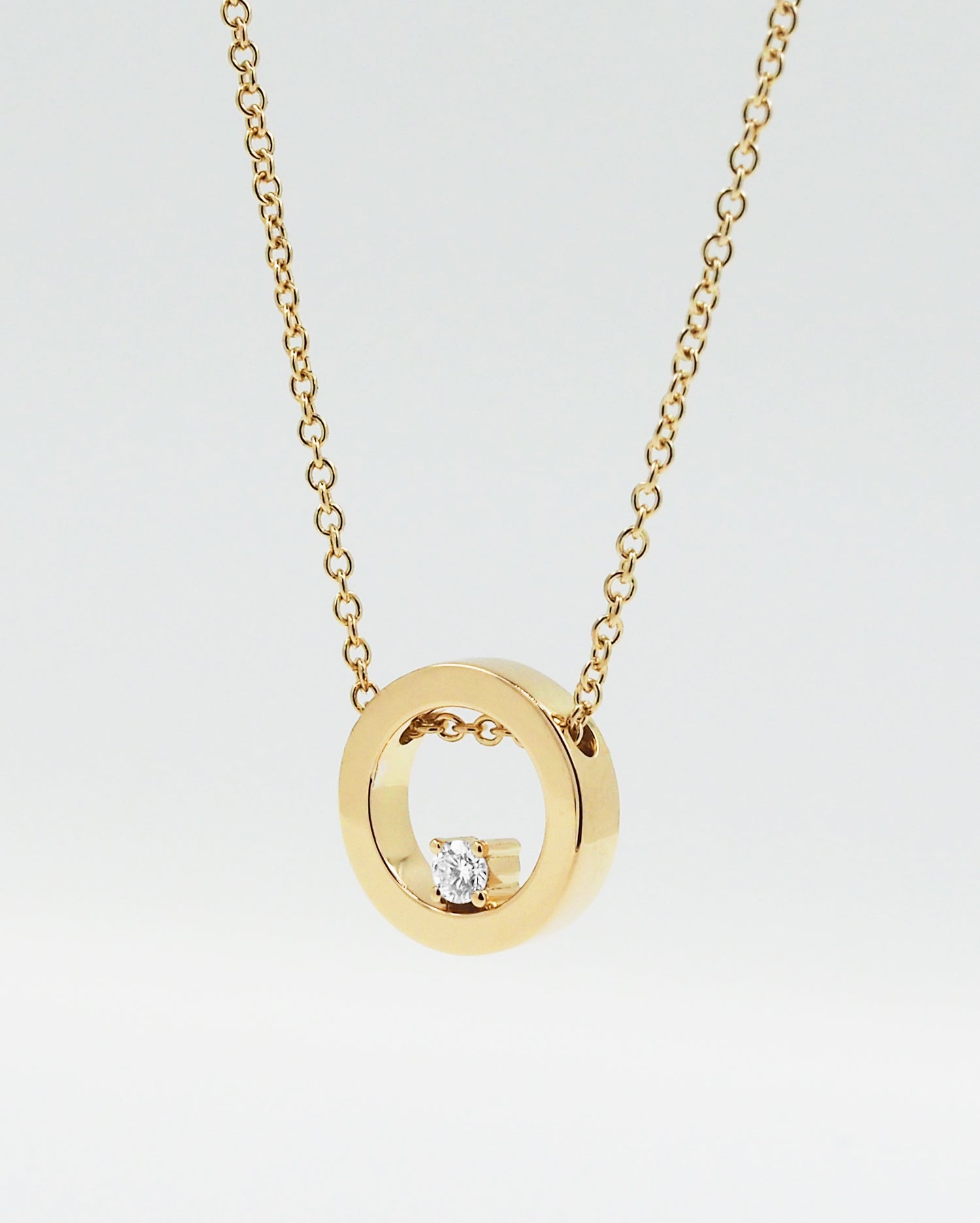 With simple and clean lines, it is the perfect accessory to combine and create a casual and elegant look. 18 kt yellow gold pendant and a diamond. Total carat weight 0.05. Diamond: FG. Clarity VS