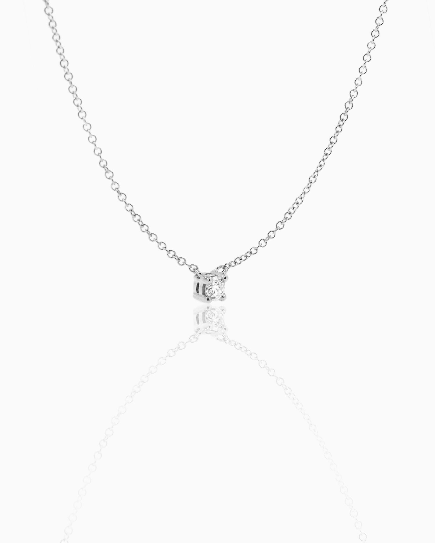 Simple, basic and timeless, this is our Metro pendant, a small bright point of light, in a minimalist style setting. Combine it with other pendants to create an elegant casual style. 18kt white gold pendant with brilliant cut diamond. Total weight in ct 0.10. (The price of the pendant includes the 18kt gold chain, 45cm long, with a ring interspersed at 42cm.) Diamond: FG. Clarity VS