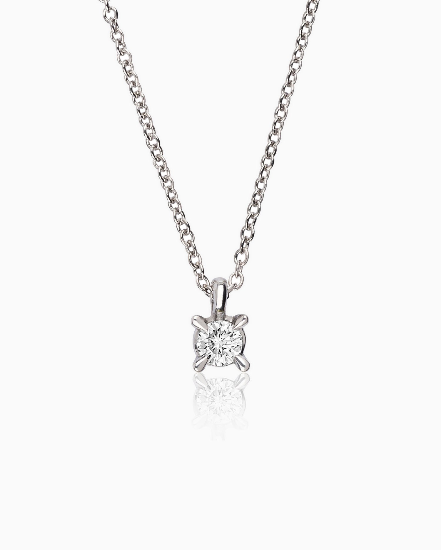The elegance of this pendant lies in the simplicity of the diamond setting, where four teardrop-shaped claws allow the diamond to reflect light in a surprising way. 18kt white gold pendant with brilliant-cut diamond. Total weight in ct 0.15. (The price of the pendant includes the 18kt gold chain, 45cm long, with a ring interspersed at 42cm.) Diamond: FG. Clarity VS