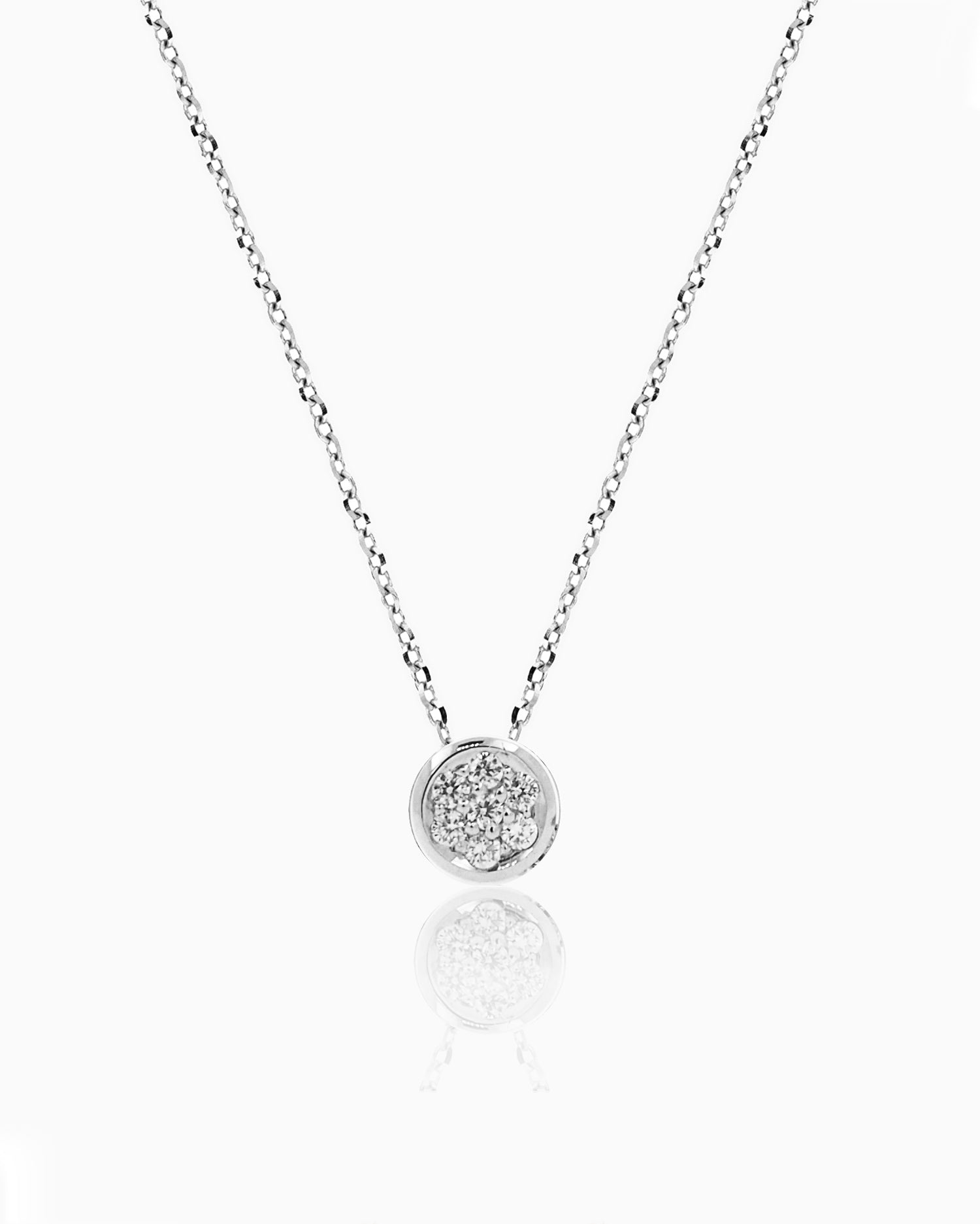 A small pavé of diamonds is drawn within a perfectly proportioned circle. An essential piece to complete your daily look. White gold pendant with brilliant-cut diamonds. Total weight in ct 0.07. (The price of the pendant includes the 18kt gold chain, 45cm long, with a ring interspersed at 42cm.) Diamond: FG. Clarity VS