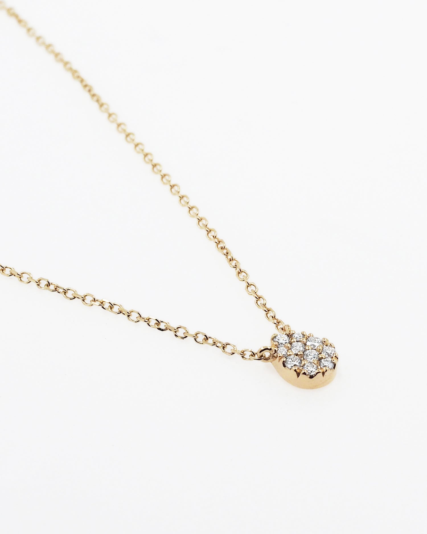 A small pavé of diamonds is drawn within a perfectly proportioned circle. An essential piece to complete your daily look. White gold pendant with brilliant-cut diamonds. Total weight in ct 0.07. (The price of the pendant includes the 18kt gold chain, 45cm long, with a ring interspersed at 42cm.) Diamond: FG. Clarity VS