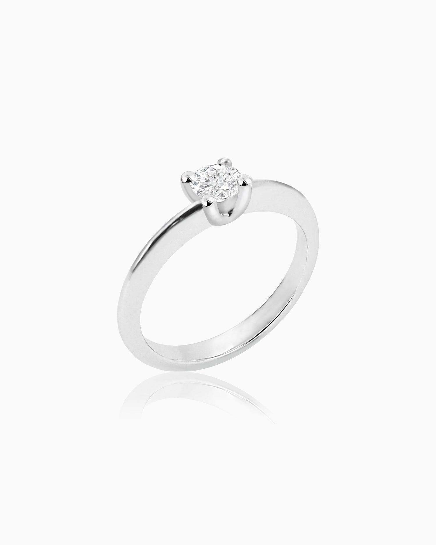 Subtle and elegant, this engagement ring with a brilliant-cut central diamond uses four V-shaped prongs, producing a halo of sparkling light. White gold ring with brilliant-cut diamond. Total weight in ct 0.20. Diamond color FG. Clarity VS.