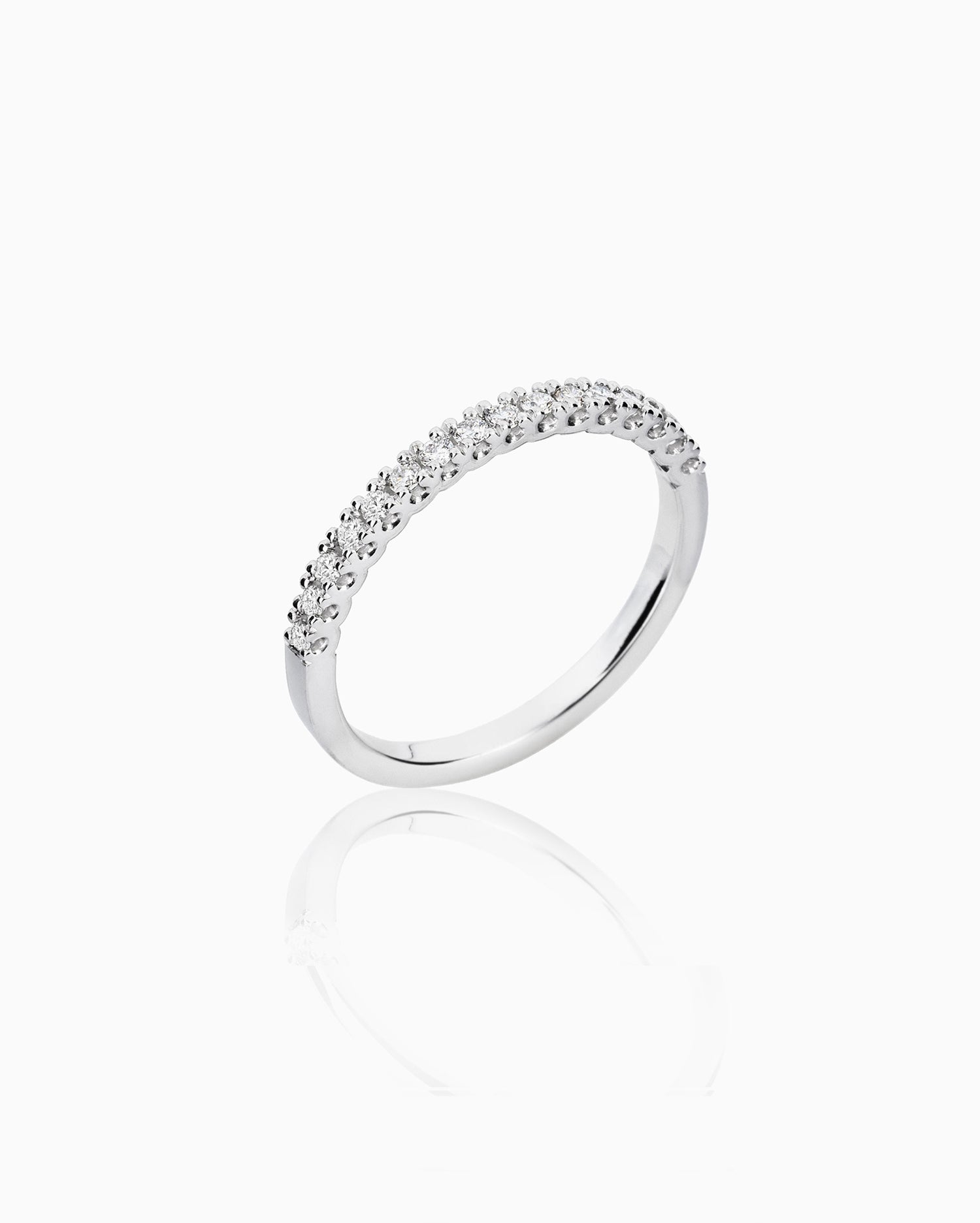 Simple and elegant, a line of brilliant light envelops this eternally beautiful reinvented classic. An ideal complement to combine with other rings. 18kt white gold ring with brilliant cut diamonds. Total carat weight 0.12. Diamond Color: FG. Clarity VS.