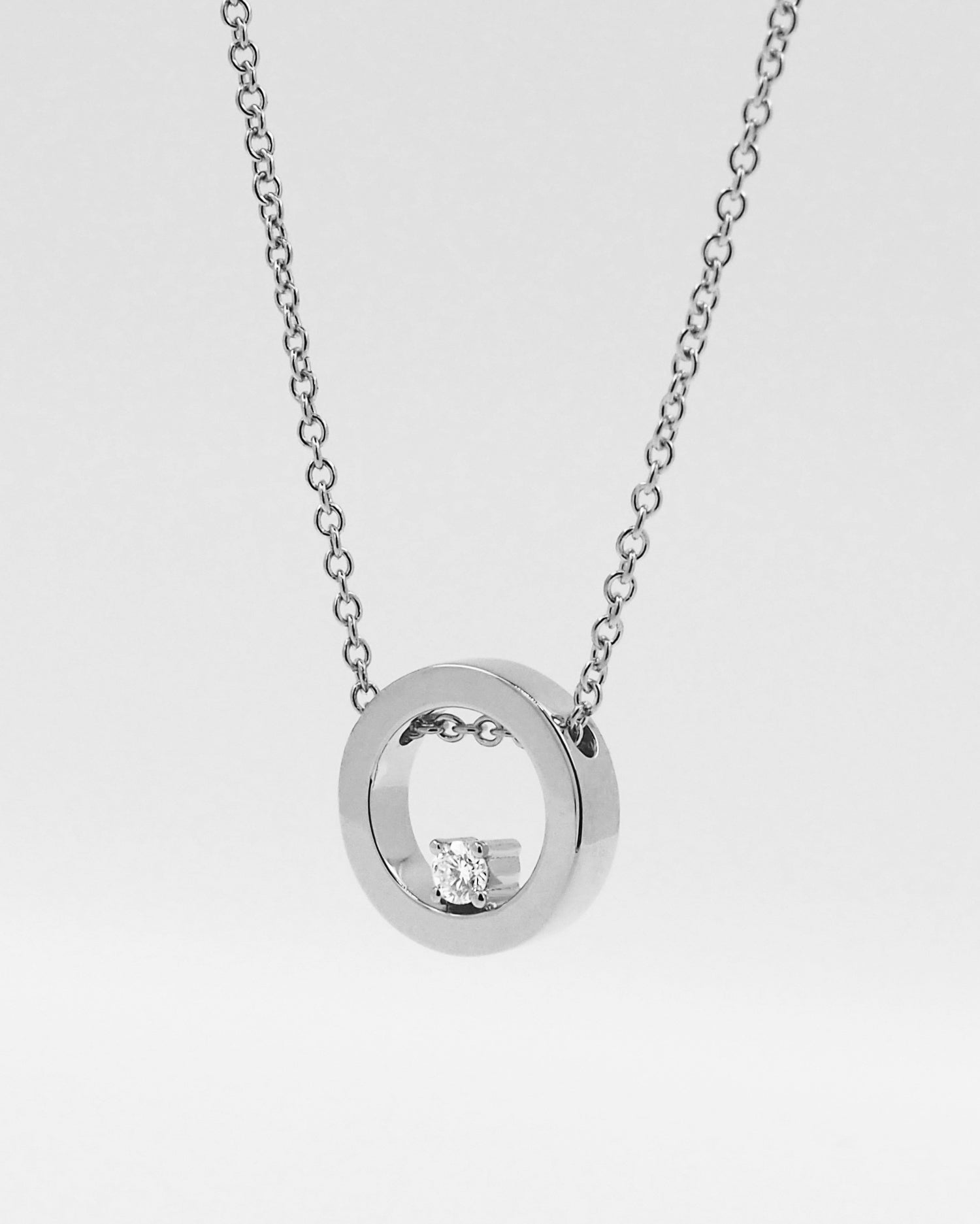With simple and clean lines, it is the perfect accessory to combine and create a casual and elegant look. 18 kt yellow gold pendant and a diamond. Total carat weight 0.05. Diamond: FG. Clarity VS