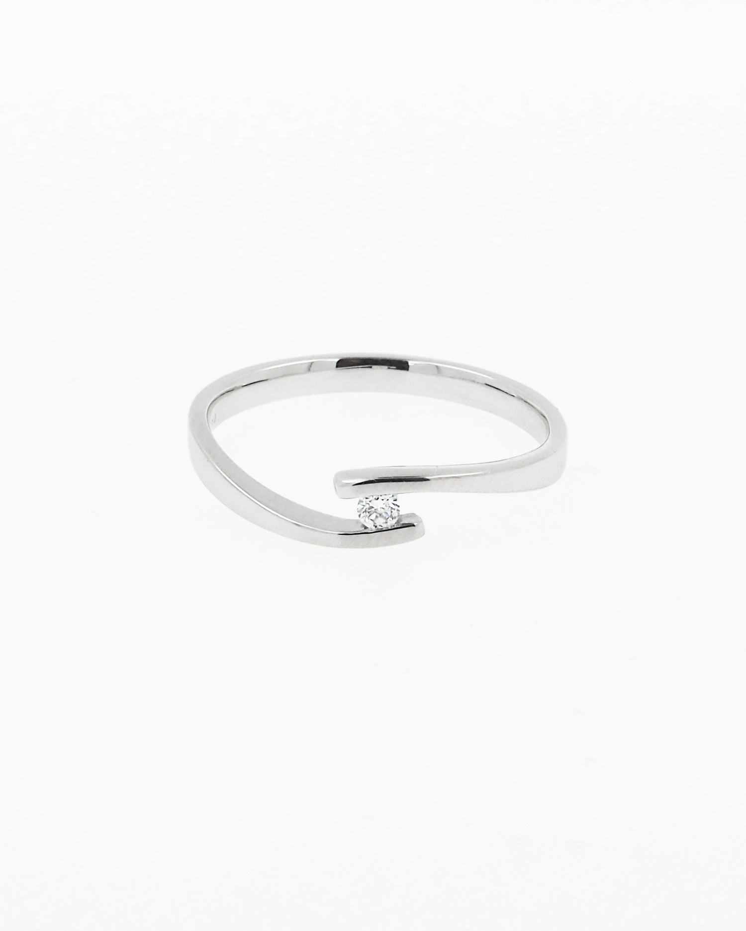 This engagement ring with a brilliant cut central diamond, uses a setting with soft and pure lines enveloping the diamond and leaving it almost suspended in the air. 18kt white gold ring with brilliant cut diamond. Total weight in ct 0.03. Diamond Color: FG. Clarity VS.