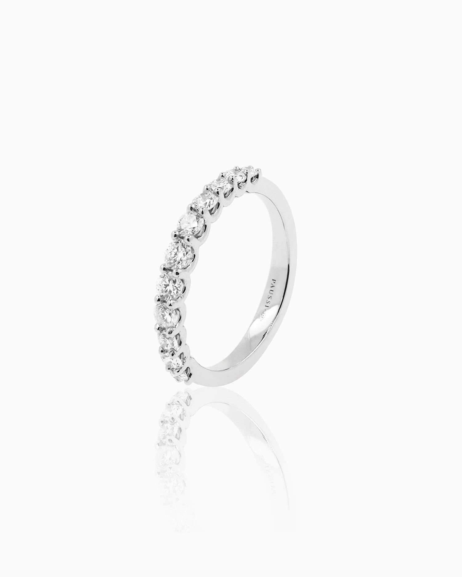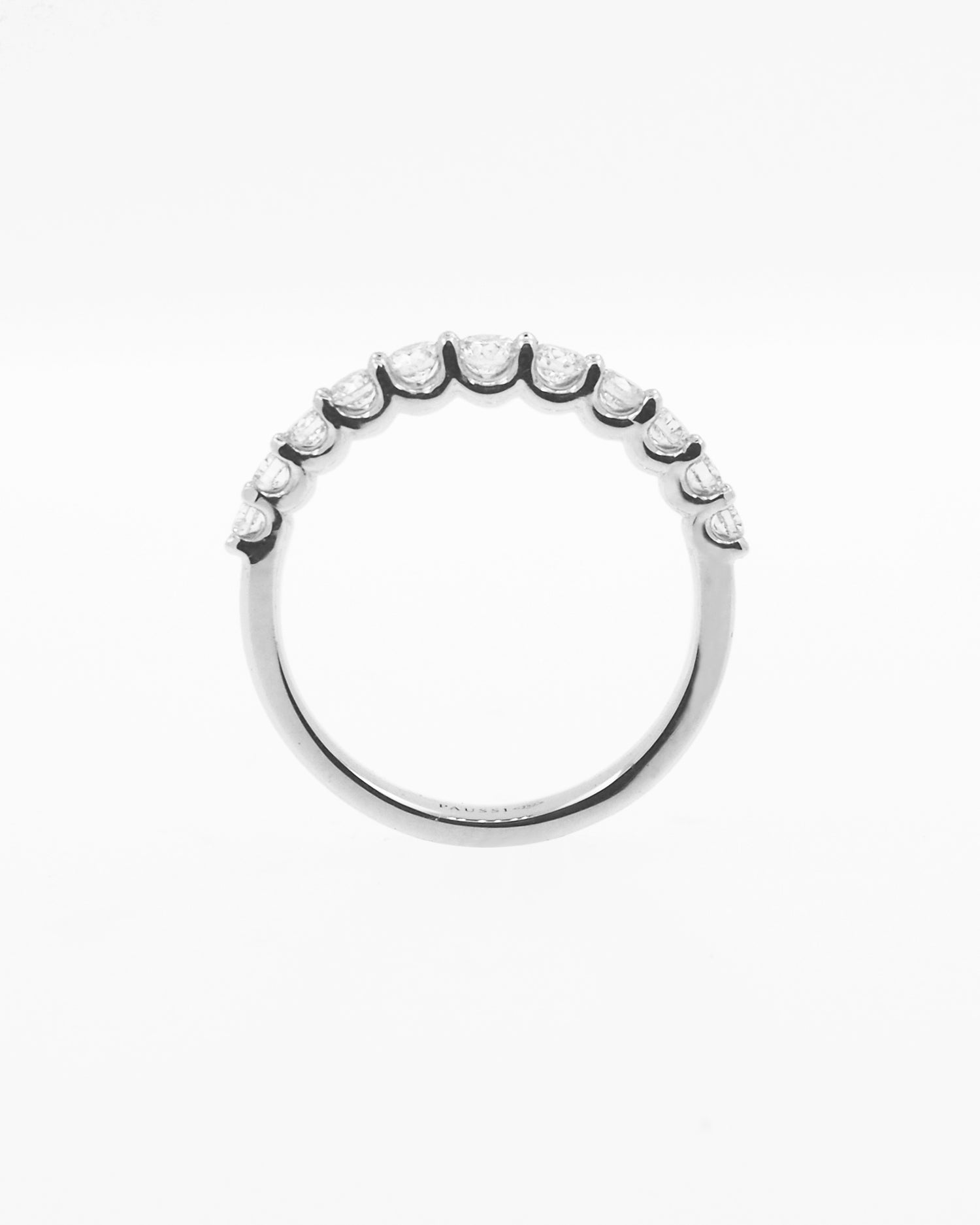 Simple and elegant, a line of brilliant light envelops this eternally beautiful reinvented classic. An ideal complement to combine with other rings. 18kt white gold ring with brilliant cut diamonds. Total carat weight 0.70. Diamond Color: FG. Clarity VS.
