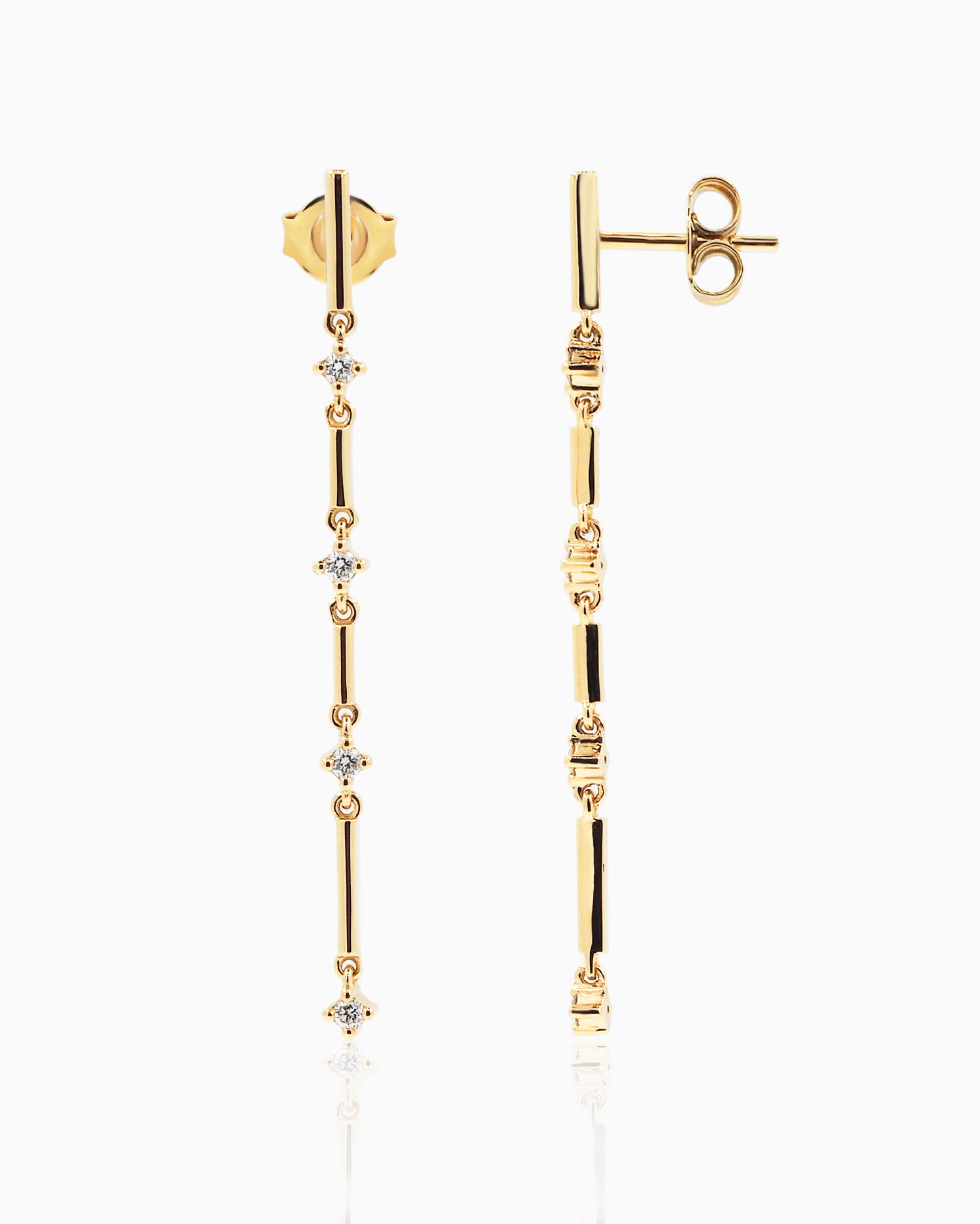 With simple and clean lines, these beautiful earrings with two moving bars are the perfect accessory to combine and create a casual and elegant look. 18kt yellow gold earrings and diamonds with a total weight of 0.41 ct. Diamond Color: FG. Clarity VS.