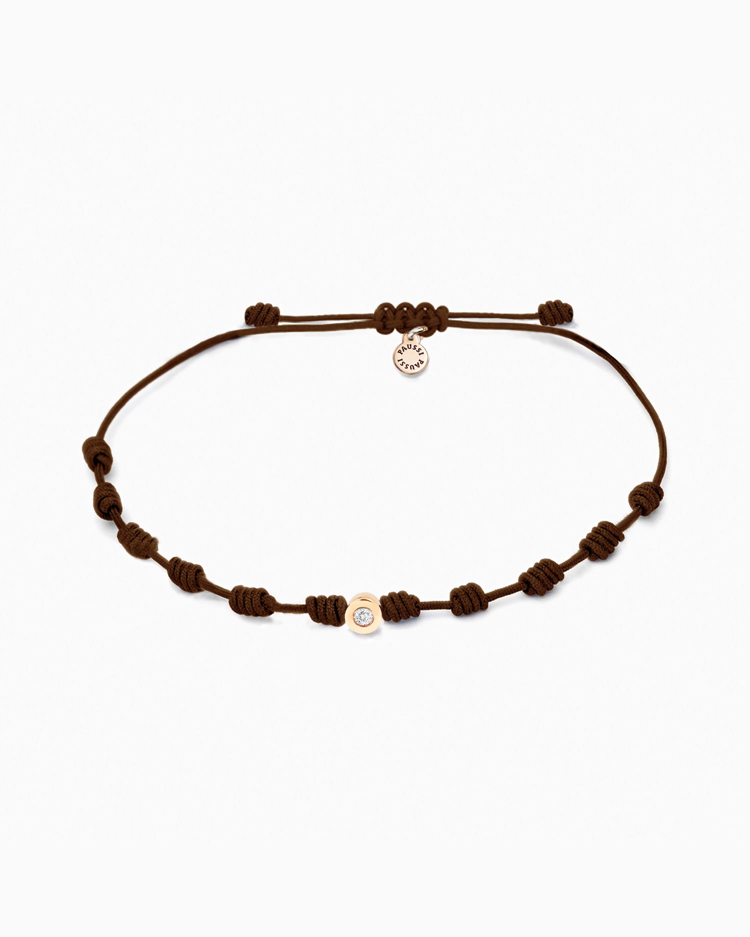 One of the most successful pieces in our collection. Made in 18kt yellow gold with black nautical thread and a 0.035 ct diamond. Total weight in ct 0.035. Diamond: FG. Clarity VS