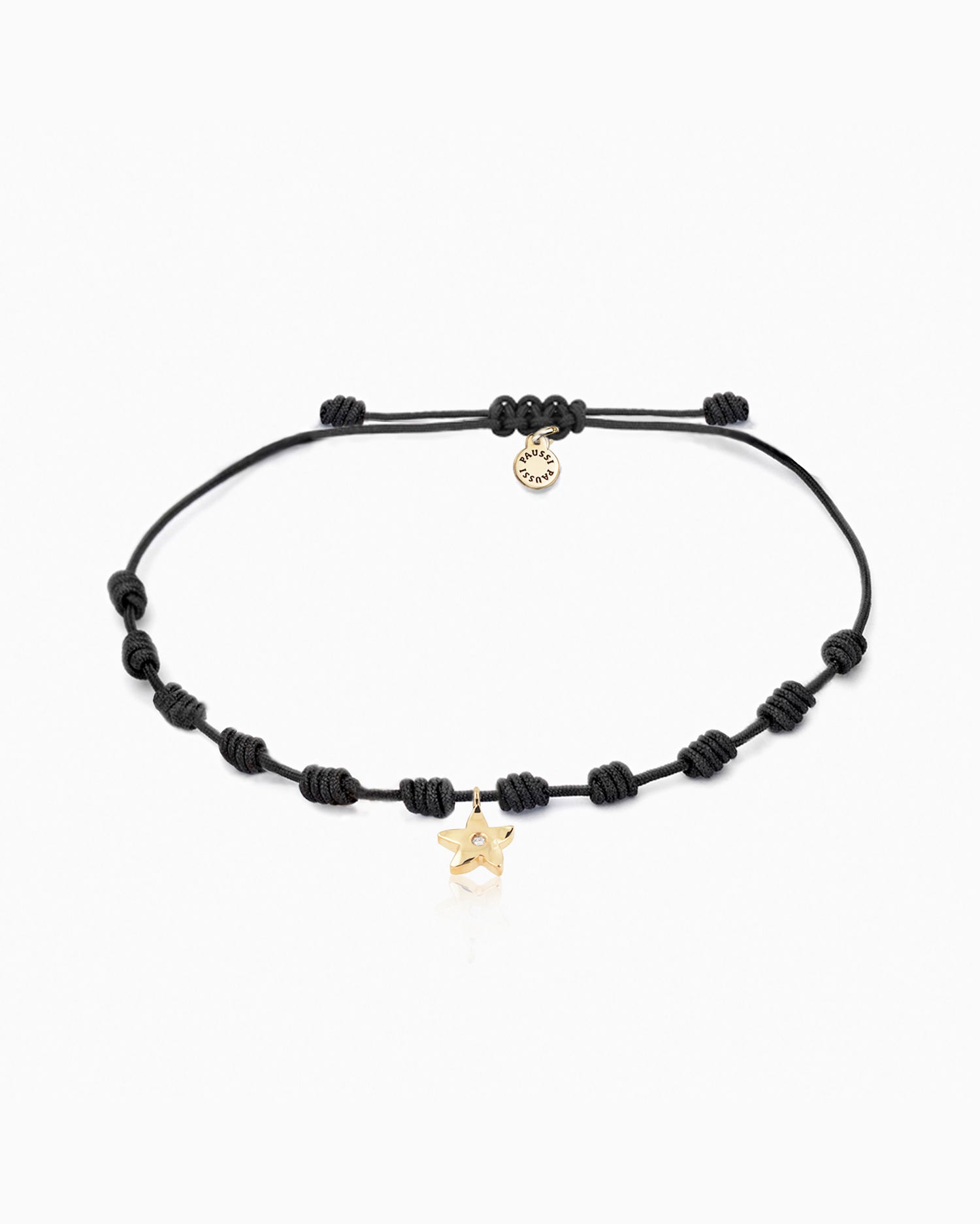 The Starfish Bracelet is one of the most popular jewels in our collection. Made of 18kt yellow gold and combined with black nautical thread.