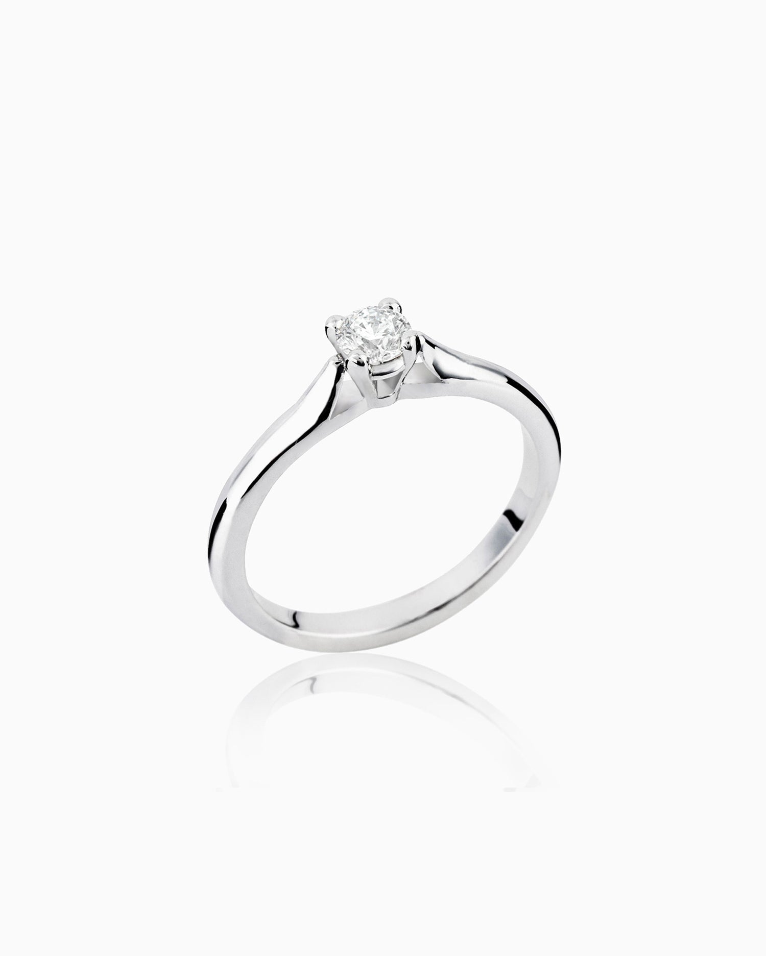 With a setting of soft and pure lines, the central diamond is almost suspended in the air, allowing the light to reflect the facets of the diamond and envelop the sophistication of the delicate set. 18kt white gold ring with brilliant cut diamond. Total weight in ct 0.14 / 0.23 / 0.38. Diamond Color: FG. Clarity VS.