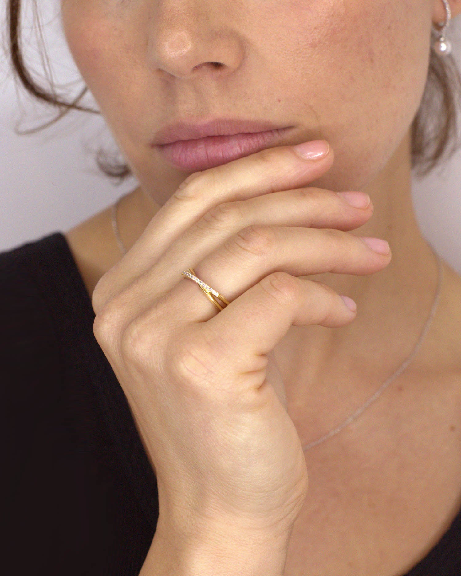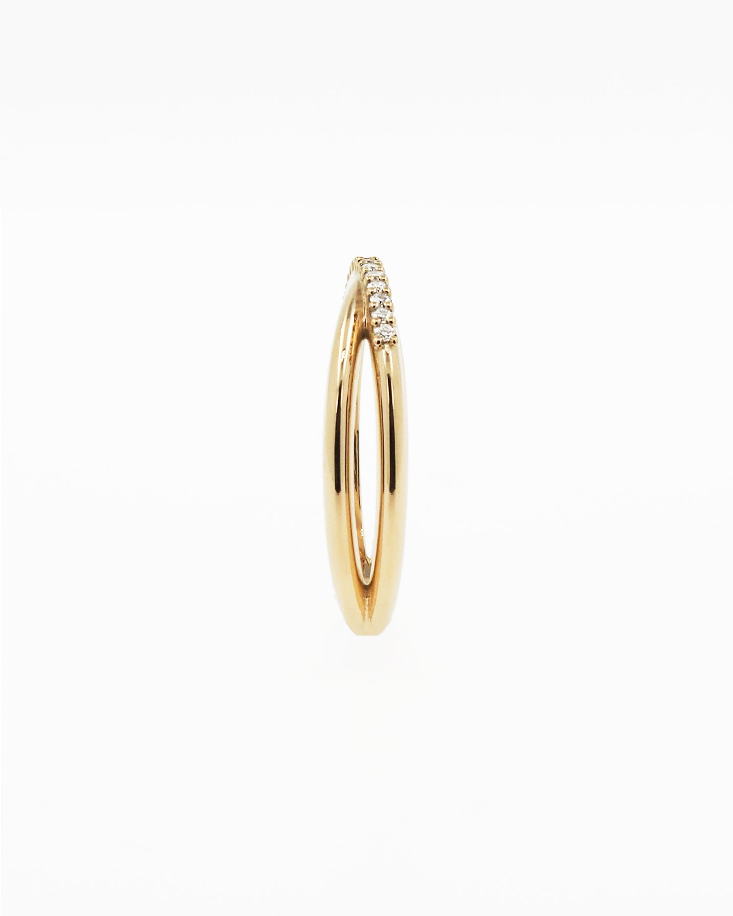 Elegance based on the perfect combination of volumes in perfect harmony. An ideal piece to wear with any look. 18kt yellow gold ring with two brilliant-cut diamonds of 0.12 ct in total. Diamond Color: FG. Clarity: VS