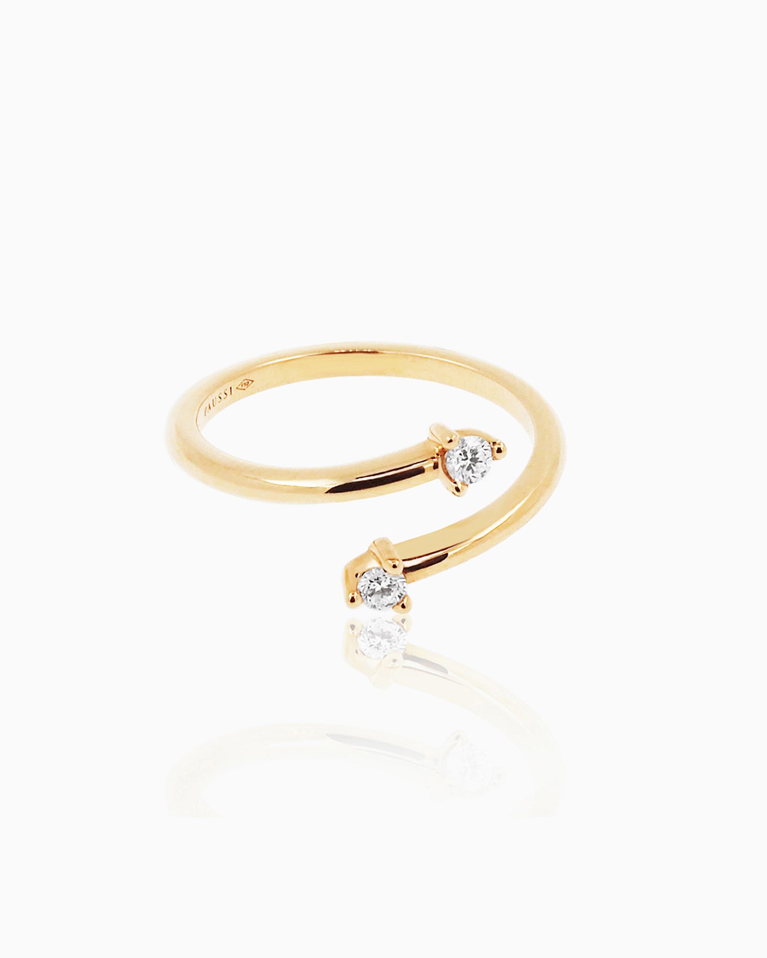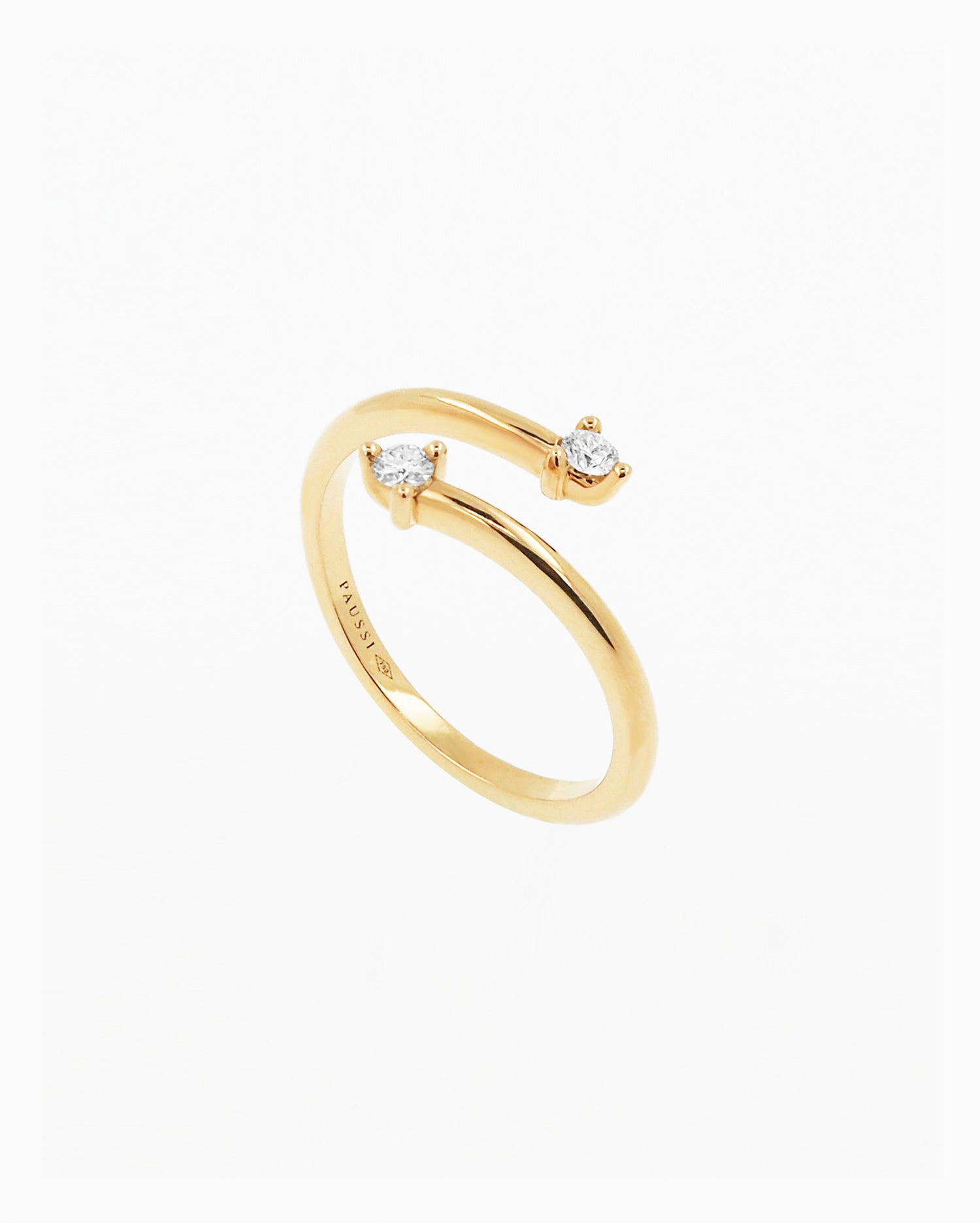 Elegance based on the perfect combination of volumes in perfect harmony. An ideal piece to wear with any look. 18kt yellow gold ring with two brilliant-cut diamonds of 0.10 ct in total. Diamond Color: FG. Clarity VS.