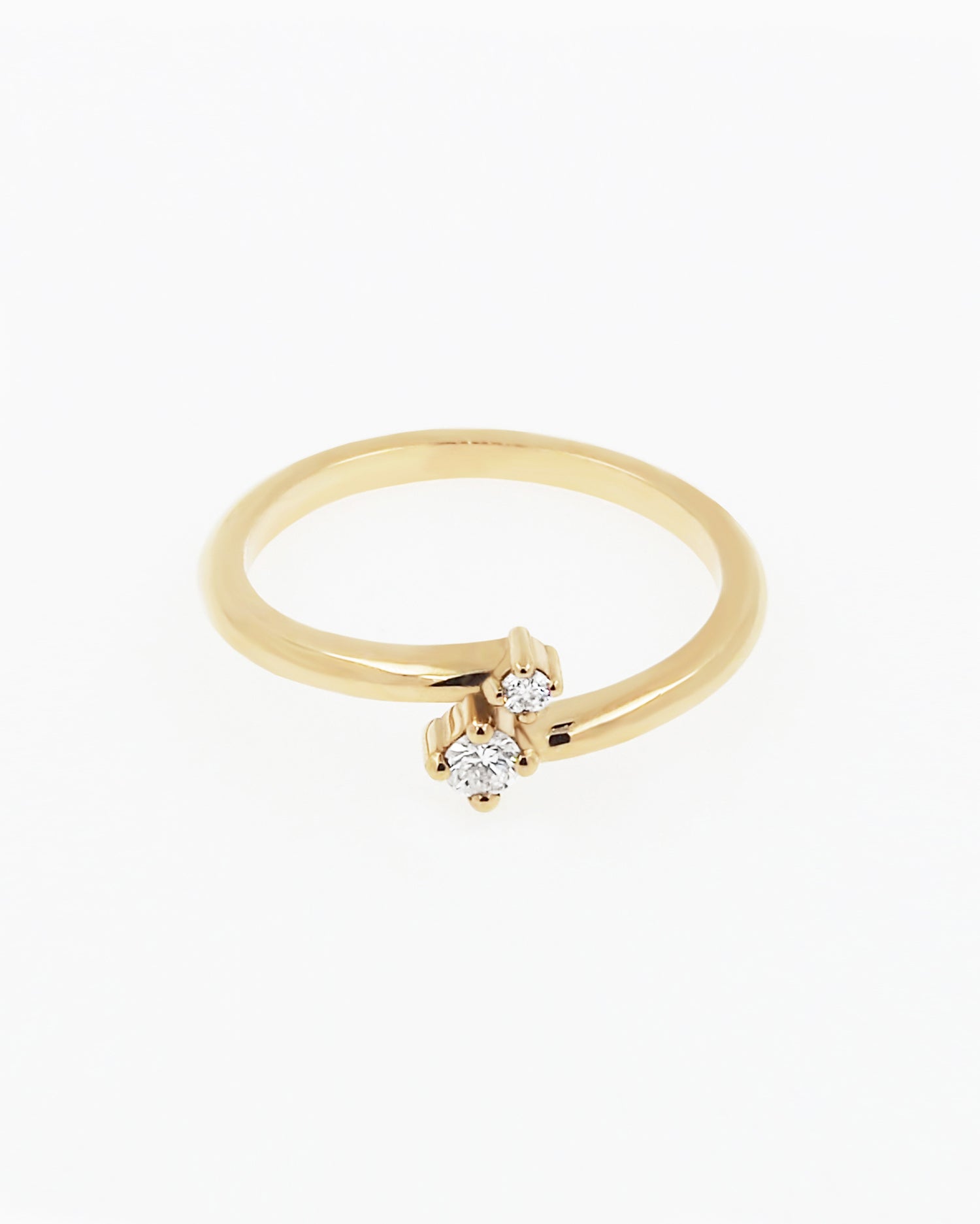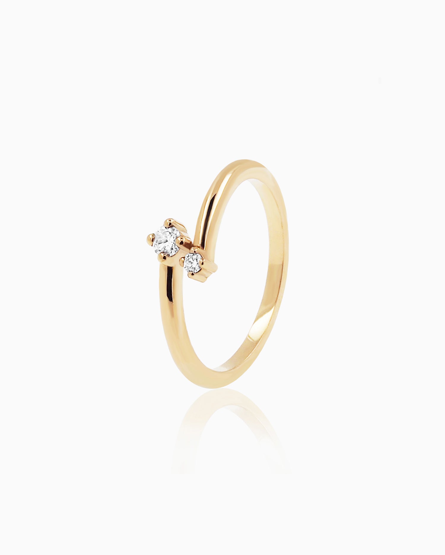Elegance based on the perfect combination of volumes in perfect harmony. An ideal piece to wear with any look. 18kt yellow gold ring with two brilliant-cut diamonds of 0.09 ct in total. Diamond Color: FG. Clarity VS.